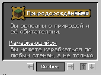 Наносите большой урон в полете Достигаете блоков и сущностей на увеличенной дистанции Вы любите высоту, и можете спать только выше 86 блоков Вы идеально перемещаетесь по паутинам Криперы боятся вас Вы падаете медленно Зелье действую дольше обычного Золотые инструменты в ваших руках куда эффективнее Пребывание в малом помещение ослабляет вас У вас на 3ХП меньше здоровья Вы не можете держать щит Когда вашего союзника о расе убивает другая раса, вы